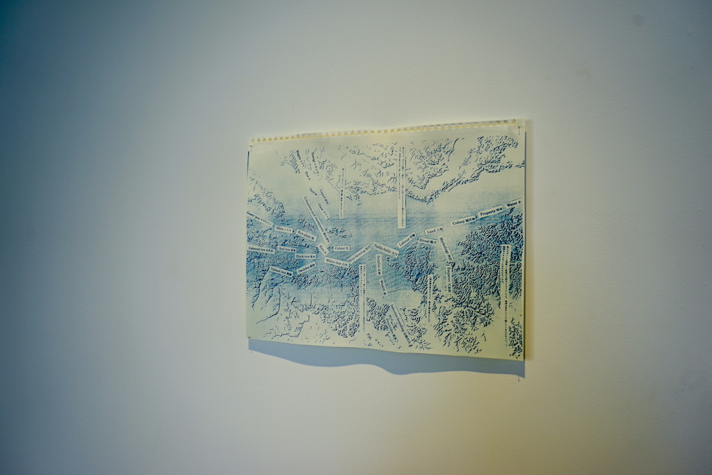 Glass made from rice husks, short story, speaker, collaged map using cyanotype